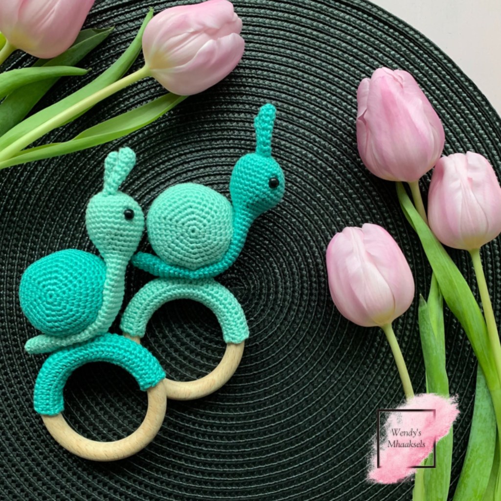 Het gratis haakpatroon van deze leuke gehaakte slakken is van Stip en Haak (KLIK HIER). Het is een superduidelijk haakpatroon. Ik maakte er babyrammelaars van.