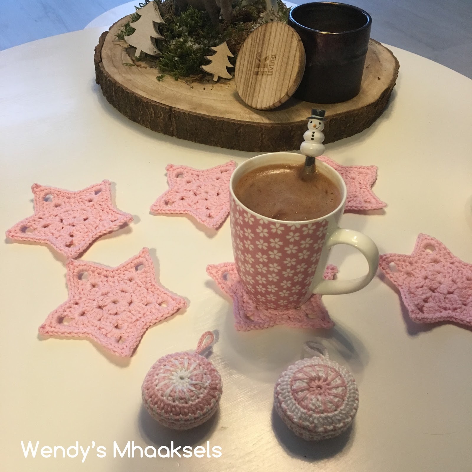 Een roze kerst;) Zowel de sterren onderzetters als de kerstornamenten zijn een gratis haakpatroon.